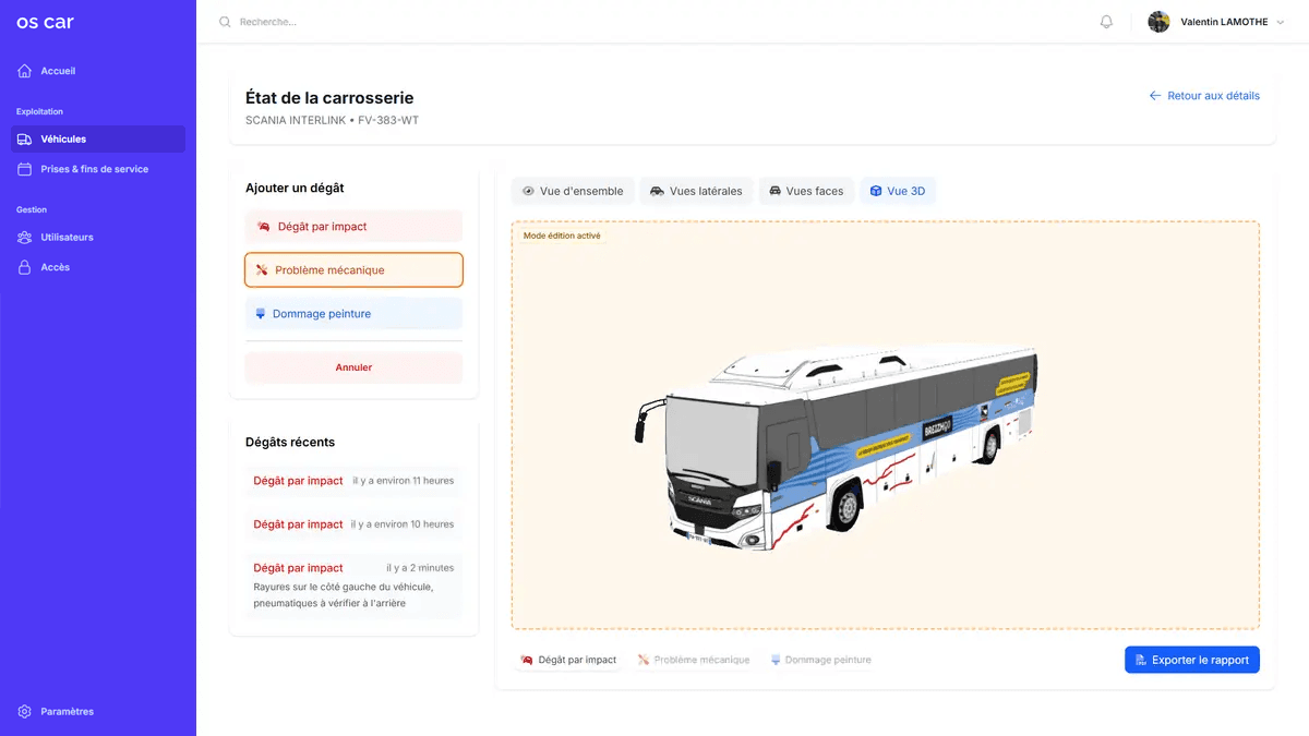 Oui. OS-CAR peut générer des rapports PDF d'état de carrosserie (avec photos et annotations) — pratiques pour envoyer au garage ou archiver l'état d'un véhicule.