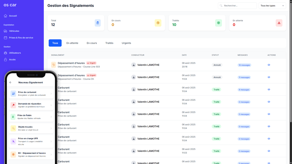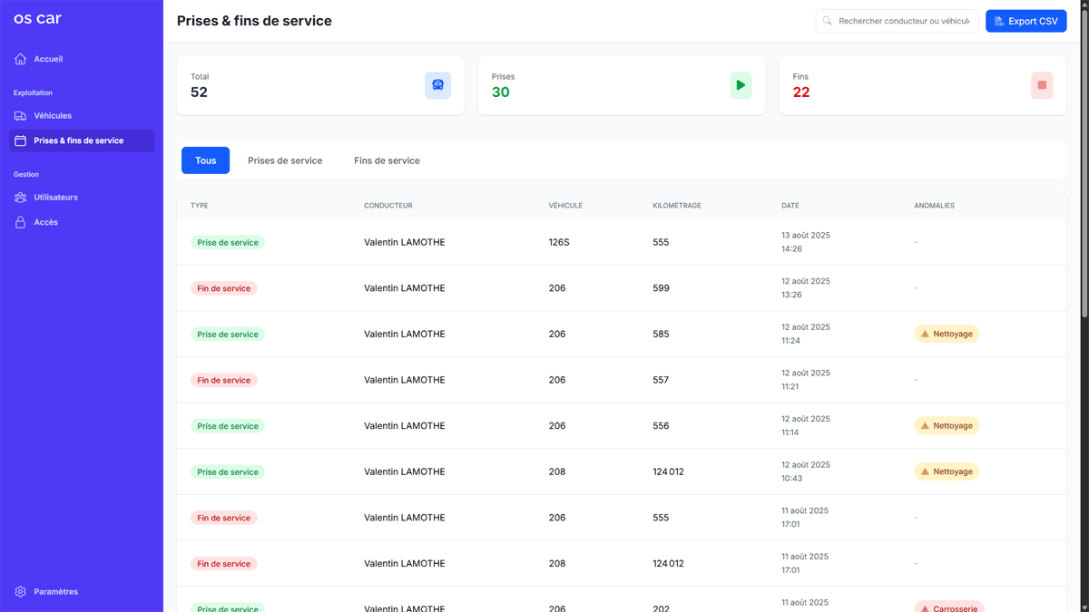 OS-CAR centralise vos opérations quotidiennes : prises et fins de service simplifiées, suivi du nettoyage, contrôle précis de l’état de carrosserie via l’application conducteur, et relevés kilométriques intégrés.